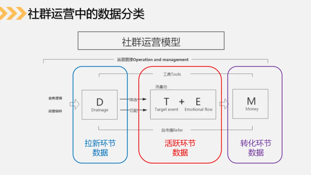 首先,我们把整个社群运营过程中可能涉及到的数据,进行一个分类。如果有小伙伴听过我之前的关于社群运营的系列课的话,就能知道,其实整个社群营销,大致可以把社群运营工作划分为三个版块,分别是引流、社群活跃和变现。