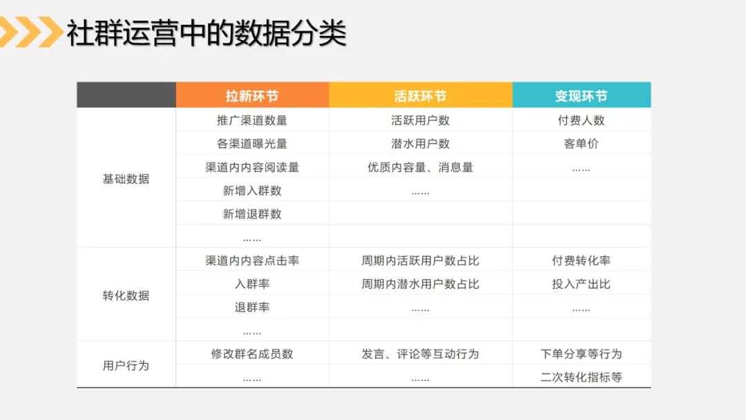 所以我们的社群运营数据,大致上也可以划分为3个核心环节,即拉新环节数据、社群活跃环节数据以及社群成交转化环节的数据。