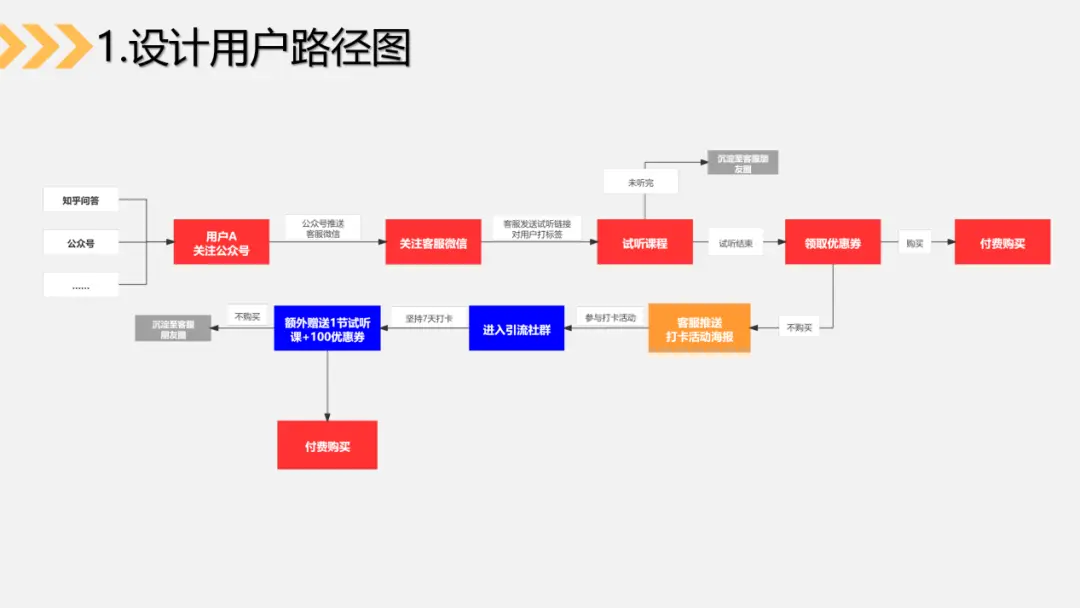 好,那以上这个就是一个简单的用户路径图了,当然我把中间的一些话术、具体的活动细则这些都省略了。