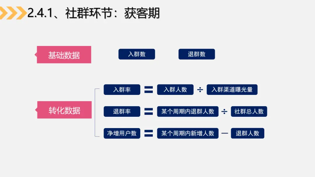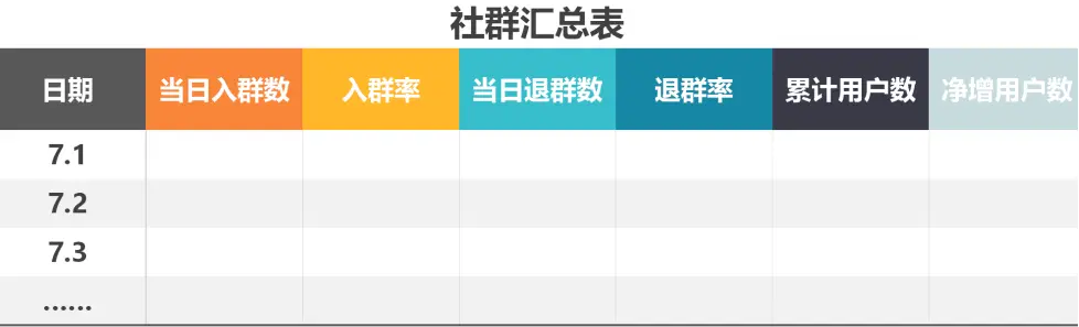 在这一阶段最主要需要我们关注的基础数据是入群数和退群数,对应的转化指标则是:入群率和退群率。