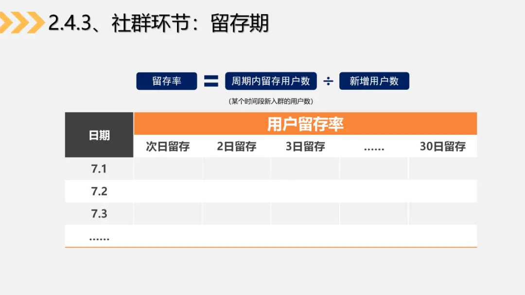 留存率=周期内留存的用户数/新增用户数;这里的新增用户数是指在某个时间段新入群的用户数。