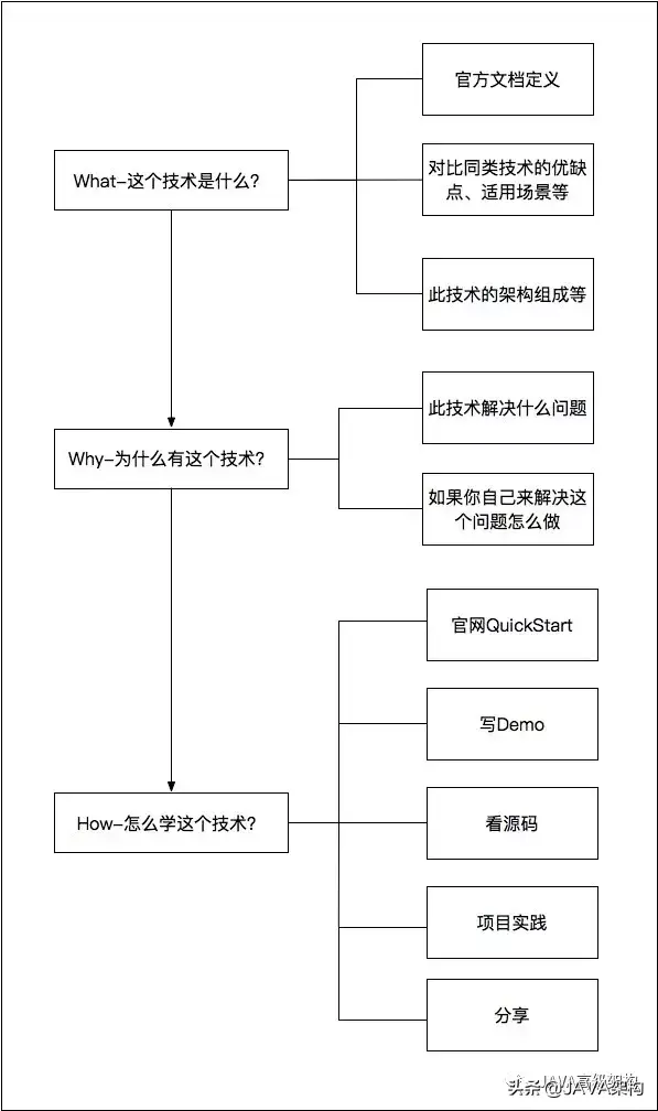上面主要讲述了宏观层面的如何学习技术,而具体到学习某一个新技术,其实也是有法可循的。如下图所示: