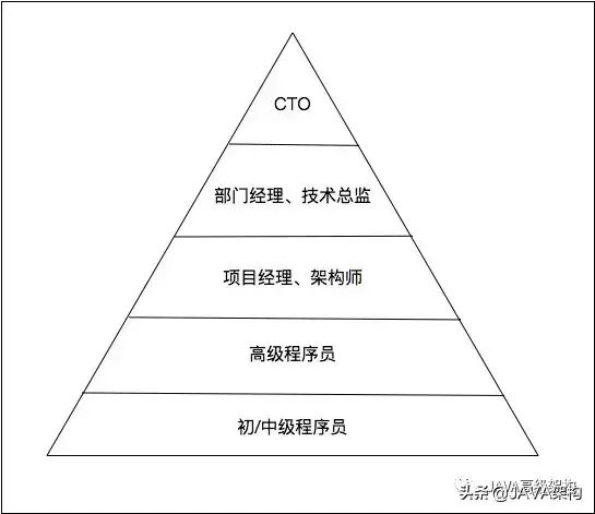 程序员是一个金字塔结构的职业体系,越往上,人越少也越难达到。如下图所示: