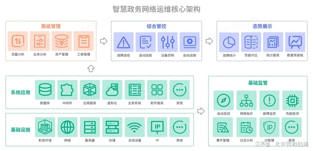 “三分建设,七分运维”,运维体系的完善程度已经是决定电子政务服务能力的重要因素。新一代数据中心、网络与政务云等数字政府基础设施、政务应用大量上线,系统架构规模迅猛发展,国产化改造替代全面深入推进,对IT运维及运营提出了更高要求,运维厂商需应对更多挑战。北京智和信通电子政务网络运维方案,通过对各类网络场景下的跨域资源整合、数据深度挖掘、异常监测、流量分析、态势感知、自动化运维等能力,保障IT基础设施和业务应用的安全、稳定、可靠运行,并利用运维数据资源对业务运营与决策提供有力支持