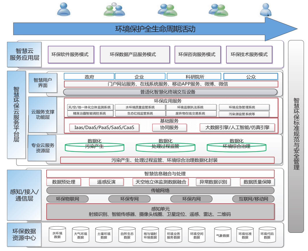 感知 / 接入 / 通信层,用于实现数据的感知、传输和处理。通过传感器、摄像头、雷达等感知单元来获取数据,通过环保物联网、专网、内网、互联网、移动网等网络传输数据;经过数据预处理、数据融合、异常数据识别、数据质量保证等处理环节来实现智慧信息的融合。