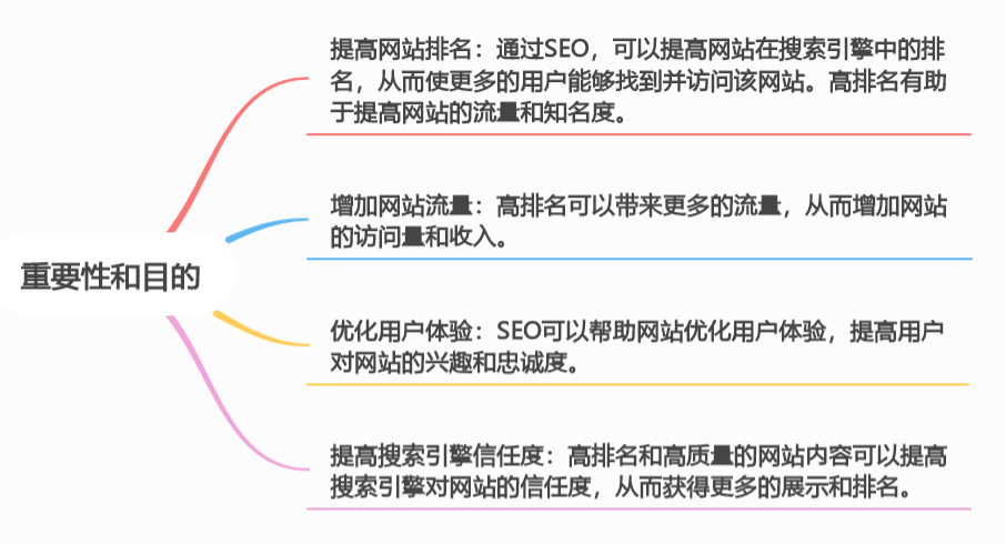 SEO(Search Engine Optimization)是一种提高搜索引擎排名和流量的方法,旨在提高网站在搜索结果中的可见性和precedence。SEO的主要目的是提高网站的流量和搜索引擎排名,从而促进网站的发展和盈利。