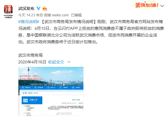 4月16日人民网也报道称,武汉的惠民消费券是企业行为,主体虽是银联支付系统,但可能会有一些商家共同赞助,如武商、中百、中南跟汉商,还有新世界,这是由这些商场赞助,由民营组织策划的一次营销活动。