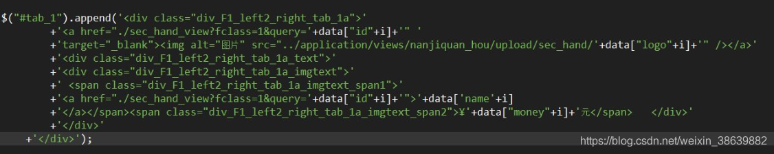 但是渲染这块就很麻烦了,由于jq的渲染方式是通过获取DOM节点进而改变数据,所以你可以选择的渲染方式有:append()、html()、text()等,总之很麻烦。而且html代码片段要在js里拼装,就会出现如下场景,那是相当的乱!