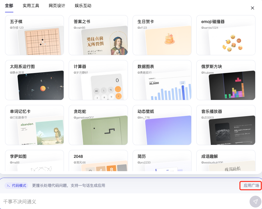 关于它的能力,官方提供了应用市场,可以看到通过通义千问的代码模式制作的一些小应用。【可以想象未来用户可以生成小应用 -> 提交审核 -> 审核通过之后就会出现在应用市场】