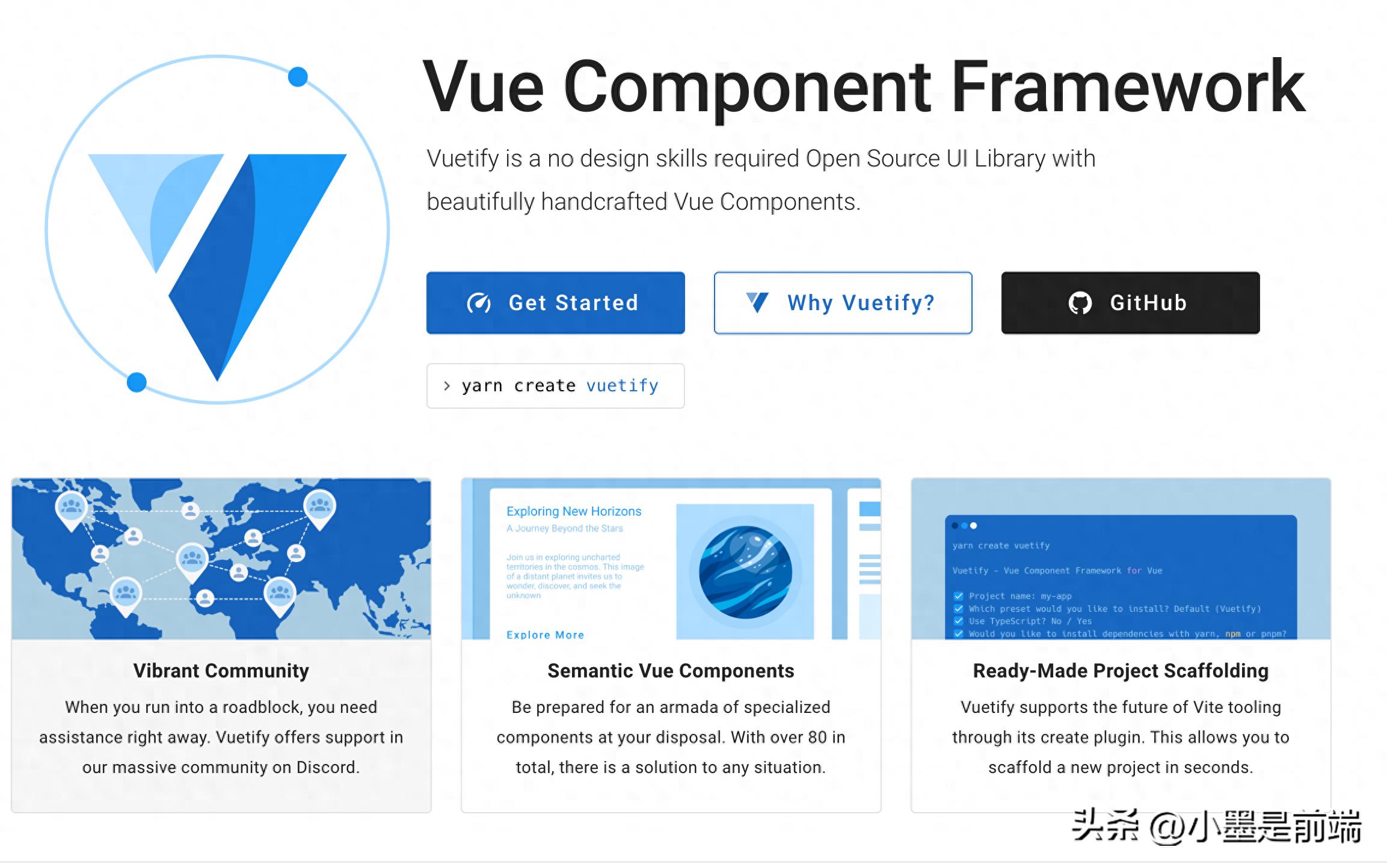 如果你也在找一个功能强大、高度可定制且易于使用的前端框架,来开发下一个Web应用程序,那么Vuetify绝对是你的不二之选。它有丰富的组件库、响应式设计会帮助快速搭建起你的应用程序。快来尝试一下Vuetify吧!