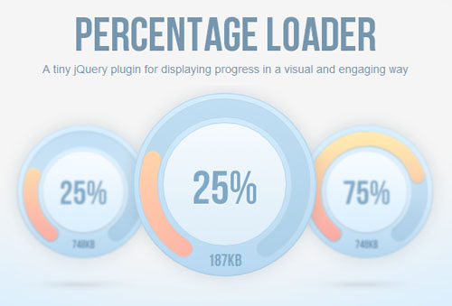 Percentage Loader 是一个 jQuery 插件, 利用 HTML5 Canvas 创造漂亮的加载效果。 压缩后只有 10kb,也可以用来作为一个拖放支持的控制器(例如一个圆形的音量按钮),它还支持在同一个页面显示多个实例。
