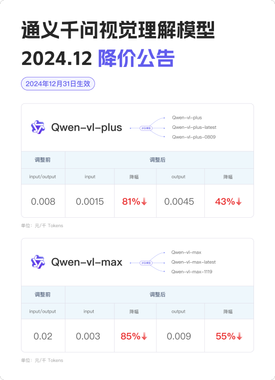 新浪科技讯 12月31日下午消息,继5月和9月两次降价后,阿里云再次宣布本年度第三轮大模型降价,通义千问视觉理解模型全线降价超80%。其中Qwen-VL-Plus直降81%,输入价格仅为0.0015元/千tokens,创下全网最低价格;更高性能的Qwen-VL-Max降至0.003元/千tokens,降幅高达85%。按照最新价格,1块钱可以最多处理大约600张720P图片,或1700张480P图片。