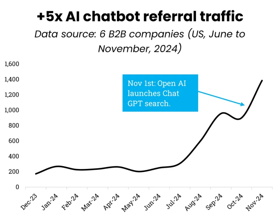一项针对头部B2B官网流量的研究发现,2024年AI搜索带来的流量竟然增长了500%!按照如此势头建模预测:三年后,B2B官网的流量将有50%以上来自AI搜索。[8]