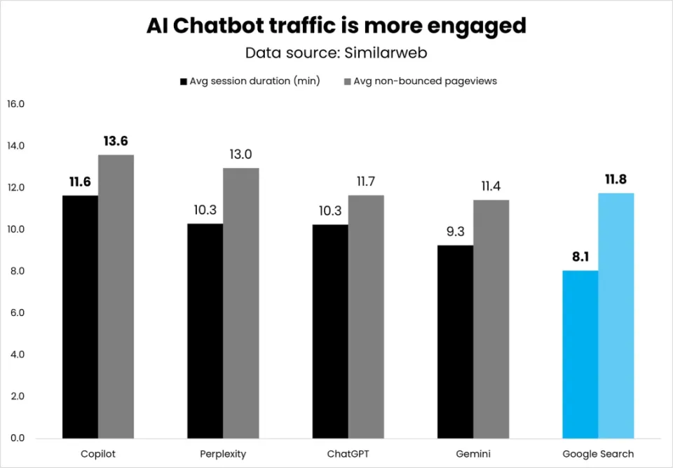 我们再从日常消费的角度来看流量价值。一项针对交易类流量的研究显示(主要是amazon、ebay、etsy等电商网站):通过AI搜索进入电商页面的用户,会比google来的停留时间更久,并且访问更多的页面内容。较长的会话持续时间结合较高的页面浏览量,意味着用户在评估产品时花费更长时间、购买的兴趣更高,显然可以总结为流量的质量更高。[9]