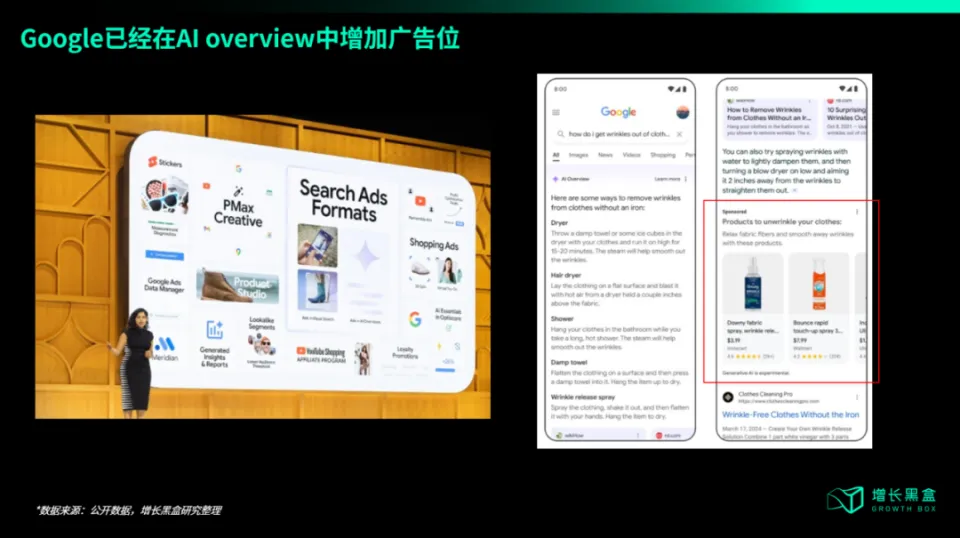 Google搜索中早就上线了一个名为“AI overview”的功能。这相当于在传统的Google搜索结果页面的最上面,增加了一个区块来展示AI对于搜索结果的总结。原本这里是没有广告的,但现在部分商品广告会出现在里面。比如用户搜索如何在洗衣服的时候去除褶皱,那么AI Overview中不仅有教程,还有洗衣液的产品广告。[15]