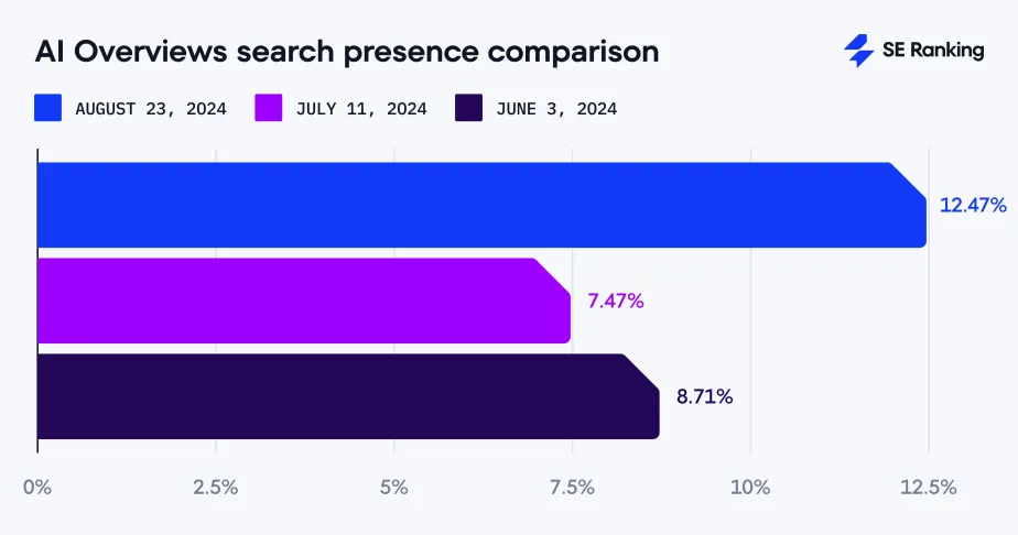 AI overviews并非百分之百展现,而是根据搜索关键词的不同,有选择性的出现。有调研显示,去年8月时差不多有12.47%的搜索结果中包含AI Overviews,比前几个月有了大幅增长,但从整体广告加载率的角度来看肯定是很低的,Google也处于尝试阶段。[16]