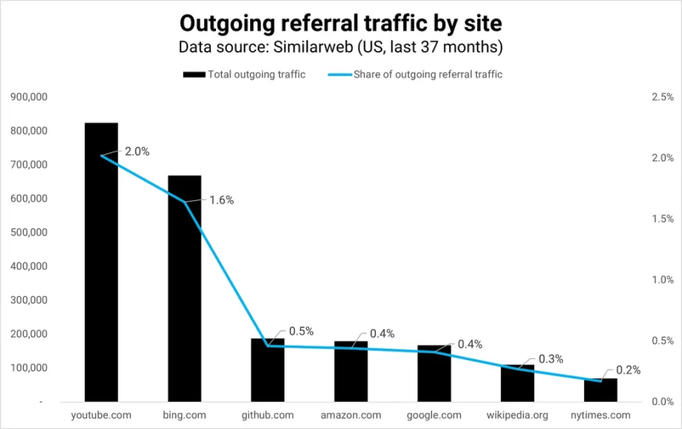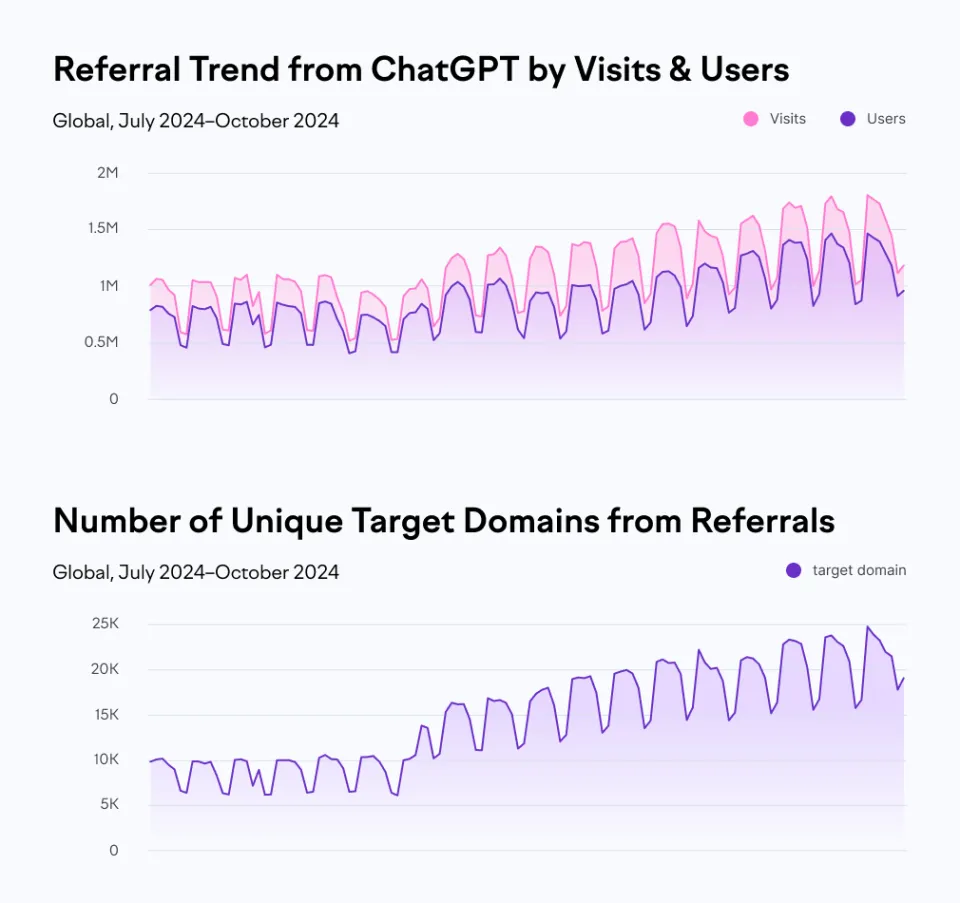 数据显示,仅仅通过ChatGPT联网功能给其他网站带来的流量,三个月增长了60%,每天都有上百万流量从ChatGPT导向外部网站。而从ChatGPT收到流量的独立域名数量,则翻了3倍。[11]