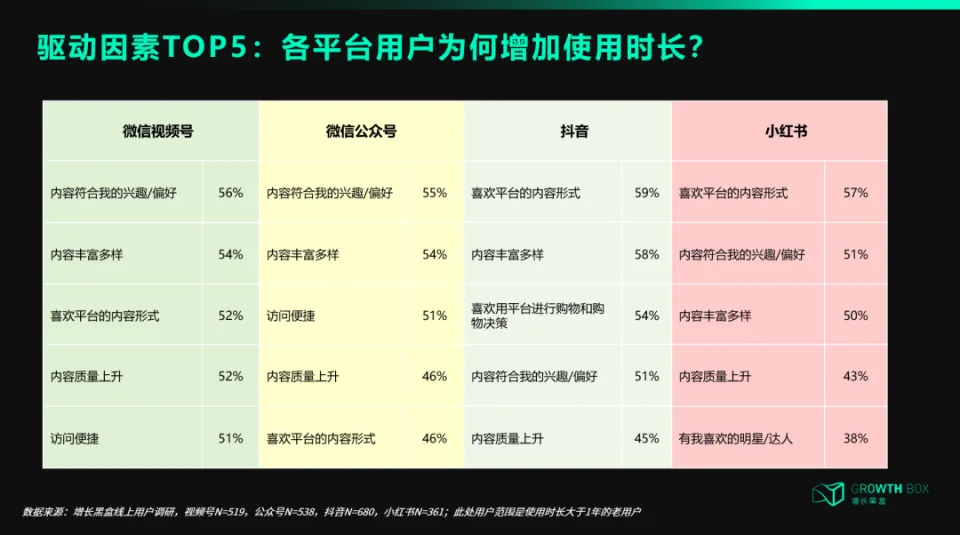 我们在2024年Q4的调研显示,无论是微信视频号还是公众号,用户增长的驱动力TOP1就是内容的匹配程度,这点跟抖音和小红书有明显差异。“内容质量上升”这一驱动力,在微信内容生态内的表现较为显著。